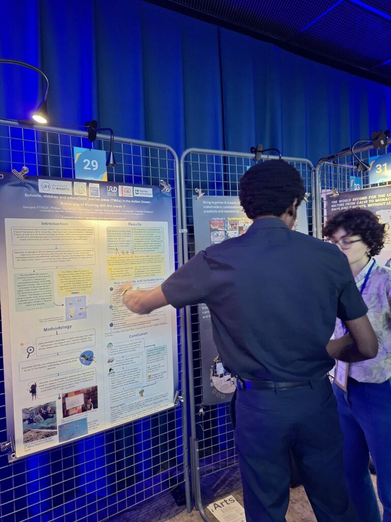 L’équipe du projet Aquamarine était au rendez-vous pour porter la voix de l’océan Indien. Lors de la session dédiée à l’éducation et à la culture océanique, les derniers travaux du projet ont été présentés sous forme de poster scientifique.