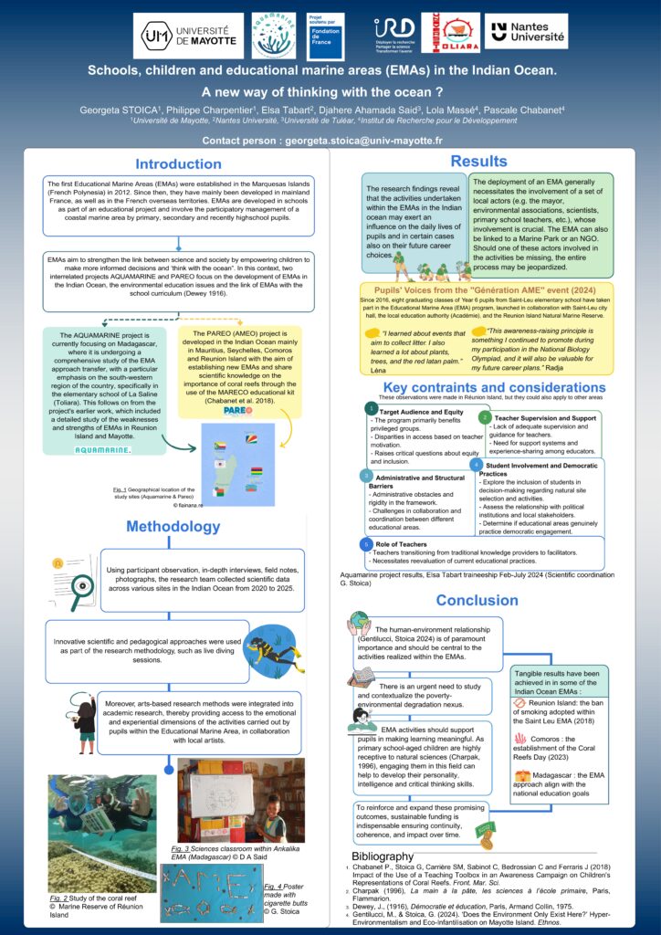 Georgeta Stoica et son équipe (Philippe Charpentier, Elsa Tabart, Djahere Ahamada Said, Lola Massé, et Pascale Chabanet), en collaboration avec l’Université de Mayotte, l’Université de Nantes et l’IRD, ont présenté leur poster intitulé “Schools, children and educational marine areas (EMAs) in the Indian Ocean. A new way of thinking with the ocean?”
